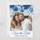 Navy blue watercolor floral photo save the date card, with a very light peri wash textured background. Customise names, dates, and information.