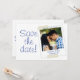 This trendy photo style save the date announcement card features the couple's photo surrounded by a white frame. A masking tape design sits at above and below the photo. A handwriting style font is used on the card. The font colour is blue.