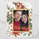 Photo Script Foil Holiday Card. This elegant Holiday photo card features a beautiful frame of hand-painted watercolor greenery, flowers, and berries with a real gold frame and an elegant script. The back includes the same artwork with a second photo and text for personalizing your message. Find matching items in the Christmas Holiday Poinsettia Collection.