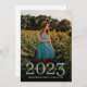 A bold boho chic modern photo graduation party invitation with photo and graduating class year. Add your graduating creative graduation photos. Suitable for college or high school. Creative individualist style. Add a second photo to the back of the invite. Hues of yellow gold and blue. You may change the colour of the type when you personalise by scrolling down and selecting "edit with design tool". Simply select the year in the layers palette to the left, then choose colours on the right.