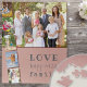 Custom Photo Puzzle with 6 of your own photos. The photo collage features 1 landscape picture plus 5 portrait photos, set out photo strip style. The design has lovely wording, especially as a gift for family, which reads .. love happiness family .. in trendy typewriter style and quirky typography. The puzzle has a background color palette of pink, maroon red and blue gray. Please browse our store for more photo gifts for family.