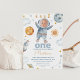 Sweet outer space or first trip around the sun first birthday invitation for a baby boy that features your little boy's photo in the space helmet. This first trip around the sun 1st birthday invitation also features, a small sun, planets, stars, spaceship and spaceman.