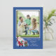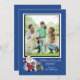 This is a fun and festive card that you can personalise. It is sure to leave a smile on the recipient's face just like Santa's here. Replace the photo shown with your own photo to send to family and friends. Underneath is a cute illustration of a laughing Santa as he reacts to seeing his chocolate Lab wearing a holiday wreath around its neck and reindeer antlers on its head. The card reads, "Ho Ho Ho," in hand lettering and then, "Wishing you joy and laughter this holiday season." Customise your own salutation, and put your name to sign the card.