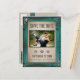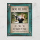Photo Turquoise Barn Wood Save The Date Cards - features reclaimed barn wood in turquoise on the front and back (printed). The wood design features a shabby chic or rustic/chipped painted look. The front has multiple light bronze/brown metal printed stars on the barn wood frame. Inside the frame is a printed vintage or parchment looking paper. You may change the demo couple's photo to one of your own.
