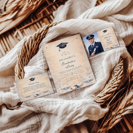 Celebrate an incredible milestone with this Air Force–inspired graduation design, created to honor dedication, discipline, and achievement. Featuring aviation elements, patriotic details, and a refined ceremonial layout, this invitation is perfect for Air Force graduates, military families, and proud supporters. Fully customizable with names, dates, and event details, it’s a timeless way to mark a moment of service, success, and new beginnings.
