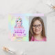 Personalized photo invite featuring a sweet unicorn illustration and pastel rainbow colors for her 8th birthday.