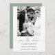 Sage green wedding save the date cards feature your photo and your details in chic lettering on the front and more wedding details on the back. Be sure to double-check your order before adding it to your cart as what you see on the screen is what will be printed. The Live Design Service can help you with your design layout if needed. MORE designs in our store.