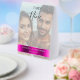 Add elegance and personalization to your wedding tables with this custom photo wedding table number, featuring a romantic couple photo with beautifully styled text elements. The top third of the design displays your table number in black calligraphy script with a white drop shadow, ensuring clarity and readability against the photo.