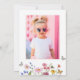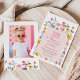 Young, wild and three themed third Birthday invitation for a girl featuring a pink arch, various colored wildflowers, butterflies and bee. This girl young, wild and three has a photo on the back and is ideal for a girl wildflowers themed third birthday party.