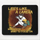 Life's Like a Camera, We Choose What to Focus On - cute photography pun humour quote has a professional, female photographer with a camera on grunge style, earth-tone colours. > Inspirational, empowerment quote to inspire women to follow their own unique visions. > Customisable: Add your own custom name or text.