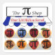 Apple, blueberry, cherry, peach, pecan, pumpkin, strawberry, and sweet potato "pi"s in a bakery window.