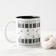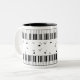 Piano keyboard and musical notes on white mug.