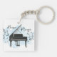 A keychain for those who love to play piano, gifts for music teachers, and pianists. The design on the keychain is a black piano with music notes floating around it on a blue watercolour background.