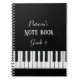 Notebook with piano keyboard and customisable white script on black background. Nice gift for a piano student or teacher.