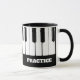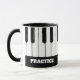Piano keys image on both sides of the mug with customisable text, "practice" printed below each image on black background. A great gift, prize, motivation or reward for piano students or teachers. Image copyright 2012 by Margaret E. Cmelik.