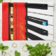 Tea towel with posterised view of piano with black and white piano keys and yellow and red piano frame.