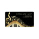 Black and gold illustration of a music keyboard with notes and clef and golden shining stars