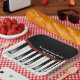 Close-up of black and white piano keyboard for piano recital party reception.