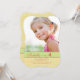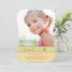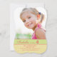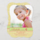 A sunny photo card with a yellow and white pattern and a lime green ribbon scalloped in berry pink. A delightful invitation any time of year.