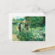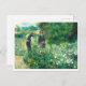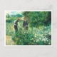 Picking Flower is a beautiful painting by Auguste Renoir featuring a light-skinned man and woman stand looking at each other, surrounded by blooming flowers and lush green trees. The palette is dominated by shades of vibrant green and blue, and is loosely painted with daubs and short strokes, making details indistinct. The man stands facing our right, almost in profile, and bends forward slightly with one hand gesturing towards the flowers. He wears a vest and trousers, a white shirt, and a butterscotch-gold hat. The woman stands near him to our right, and faces us with her head turned to look at the man. She wears a long gown, a cherry-red hat, and what appears to be a blue and cherry-red scarf around her neck.
