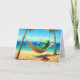 Big green dill pickle in a hammock hanging between two tropical palm trees on a beach with flip-flops.