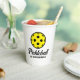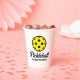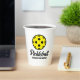 Pickleball Birthday party cups with funny quote. Custom party supplies with yellow ball logo and script text. Cute design for fan, player, sports coach, mum, dad, mother, wife, daughter, teenager, husband, couple etc. Change ball logo into any colour. Personalise with your own funny quote or team name.