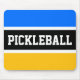 This sporty, colourful design features athletic PICKLEBALL text inside a wide black stripe highlighted with white stripes against bright blue and yellow orange backgrounds.