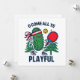 Funny "O Come All Ye Playful" pickleball Christmas design depicts a pickle character wearing a headband and playing pickleball and Christmas trees in the background. This simple yet festive Christmas pickleball design makes a nice gift for the pickleball lover in your life.