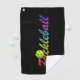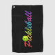 A colorful design featuring the word 'Pickleball" in shades of red, yellow, green, blue, pink and purple on a contrasting black background. Makes a great personalized gift for any pickleball enthusiast.