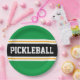 This sporty design features bold PICKLEBALL text inside a wide black horizontal centre racing stripe highlighted with twin floating white pinstripes against bright green outer stripes. The text can be personalised.