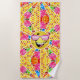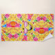 Pickleball summer vacation beach towel. Pickleball is a court sport for any age and athletic ability. Between the dinking, banging and long rallies lifelong friendships are forged. Super colourful graphic with pickleball balls, yellow, orange honeycombs, hexagon shapes, and a big yellow pickleball wearing sunglasses and smiling.