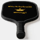 Black with gold “Pickleball King” paddle. Personalise with the name of the player by editing the example name on the other side of the paddle. To make a great gift, this can be paired with the matching “Pickleball Queen” paddle and other products in this store like a matching coffee or travel mug. Note that this paddle has a black face and handle.