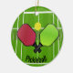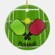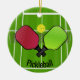 Pickleball Design Ornament with customizable text on both sides. Pickleball is a racket/paddle sport that was created by combining elements of several other racket sports. Two or four players use solid paddles to hit a perforated polymer ball over a net.