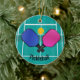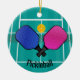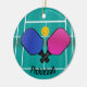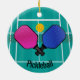 Pickleball Design Ornament with customisable text on both sides. Pickleball is a racket/paddle sport that was created by combining elements of several other racket sports. Two or four players use solid paddles to hit a perforated polymer ball over a net.