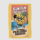 SUN FUN AND SLICES is the bold, playful headline featured on this vibrant towel, with PICKLEBALL PARADISE printed below to complete the tropical theme. The design showcases a cheerful pickleball mascot wearing sunglasses, a black shirt, grey shorts, and green sneakers, running across a sunny beach with paddle in hand. A radiant sunset, palm trees, ocean waves, and flying birds create a lively vacation vibe. Ideal for any pickleball club, team, or tournament hosted at a tourist resort or beachside destination. This large beach towel makes a perfect gift for any pickleballer, fan, coach, or player who loves stylish, funny, and sporty gear. Whether you're dinking in the kitchen or relaxing after a match, this towel brings the spirit of pickleball paradise to life.