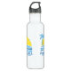 A sporty water bottle featuring a fun pickleball design of a "pickleball sun" framed by a tropical palm tree and ocean waves. Add two lines of custom text to personalise. Makes a great gift for any pickleball player, club or team organiser, teammate or instructor.