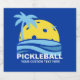 A fun pickleball beer or gwine label eaturing a pickleball "sun" framed by a tropical palm tree and blue ocean waves. Just add your custom text to personalise.