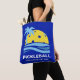 Custom Tote bag featuring a pickleball "sun" framed by a tropical palm tree and blue ocean waves. Add 2 lines of custom text to personalise. Nice and roomy so it will fit a lot of pickleball gear. Makes a great gift for pickleball players, teams/clubs, organizers and more.