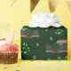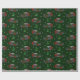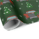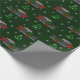 This snowplow themed Christmas wrapping paper features illustrations of a pickup truck with a plough on it that's decorated with a festive Christmas wreath. The graphics are set against a dark green background that's accented with illustrations of snow-covered trees and snowflakes.