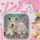 Watercolor memorial of sweet dogs, with multicolored quilt and background of lavender