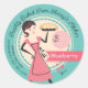 Retro pie woman or housewife wearing an apron and carrying a fresh pie on this sticker for a pie baking biz or bakery, featuring your choice of colour scheme and personalised text.