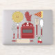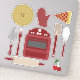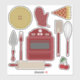 Stickers featuring a red pie kitchen theme including a stove, fork, spatula, rolling pin, oven mitt, pie server, whisk, cherries, pie, and pie slice.