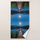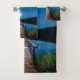 Towel set with a beautiful photograph of a wooden pier stretching out over a calm lake.