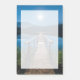 Sticky notes with a beautiful photograph of a wooden pier stretching out over a calm lake.