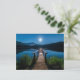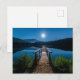 A postcard with a beautiful photograph of a wooden pier stretching out over a calm lake.