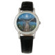 A watch with a beautiful photograph of a wooden pier stretching out over a calm lake.