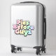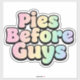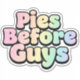 Show off your sweet priorities with this fun, vibrant "Pies Before Guys" sticker! Featuring a bubbly, retro font set in a soft pastel rainbow color palette, this large decal is perfect for anyone who loves dessert and embodies a playful, independent spirit. The design has a lovely translucent effect within the lettering that gives the colors depth and visual interest. Use it to personalize your laptop, water bottle, car, or suitcase to instantly add personality and a statement piece that celebrates your love for the superior joy of a perfectly baked pie.
