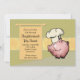 A pig with a chef's hat invites guests to a luau or any celebration with a pig roast. The back field is two-tone green with a wide, festive, floral band. Your wording is posted on a hanging banner.