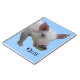 Photograph of piglet on blue (customisable) background with the word "oink" printed below. (text customisable)