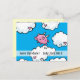 A jolly "Save the Date" postcard proving that pigs do fly and that dreams can come true. A happy little pink pig dances on clouds adorned with hearts against a blue background. Below the pig reads "Save the Date" and has an option for you to personalised both the back and the front of the postcard.
